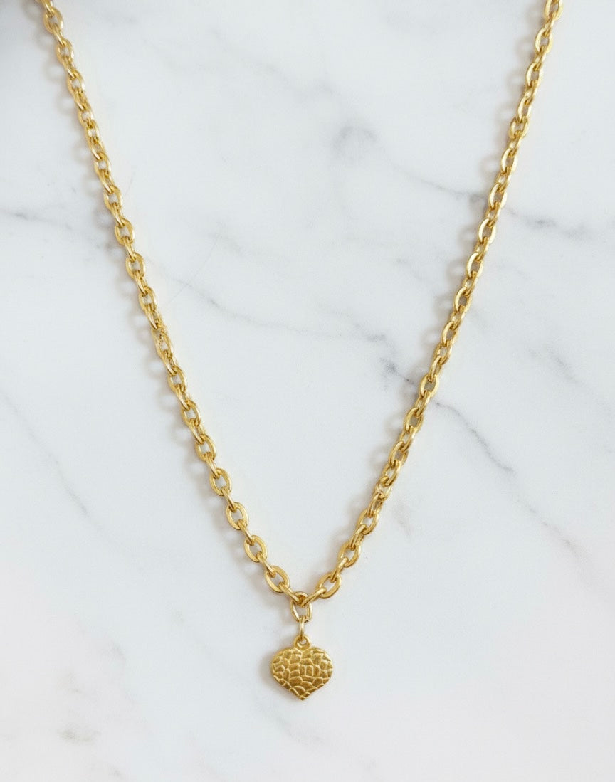 A touch of vintage-inspired charm, the Elara Textured Heart Necklace features a delicate hammered heart pendant on a high-polish 18K gold-plated stainless steel link chain.