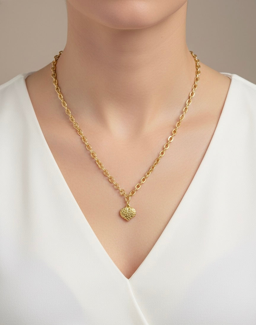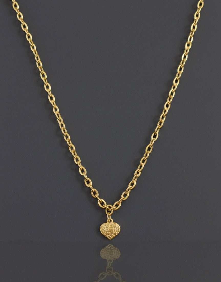 • Design: Polished link chain with a textured, hammered-effect heart pendant.