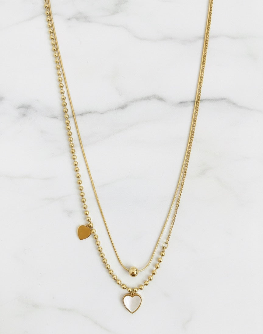 A delicate harmony of texture and shine, the Aura Beaded Layered Necklace features a gold bead chain and a shimmering heart pendant set on 18K gold-plated stainless steel.