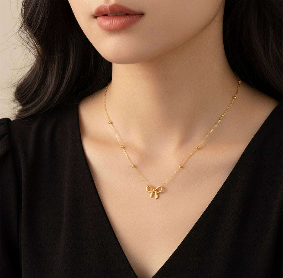 Add a subtle touch of elegance to your everyday look with this delicate Bow Necklace, crafted from durable stainless steel and finished with radiant 18K gold plating that resists tarnish. Perfect for layering or wearing on its own, this bow necklace is a timeless piece you’ll reach for again and again.